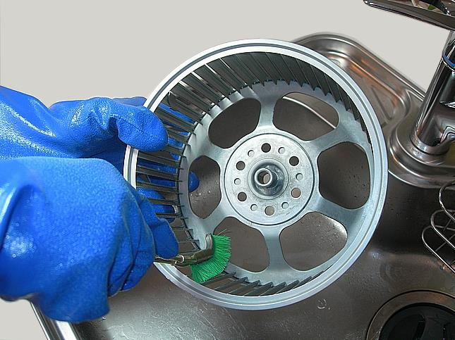 取り外した部品は浸け置き洗浄をして、酷い油汚れを浮かしていきます。浸け置き後は丁寧に汚れを擦り落としていきます。本体部分やフード部分は専用洗剤をふりかけ汚れを浮かせたら丁寧に油を除去していきます。